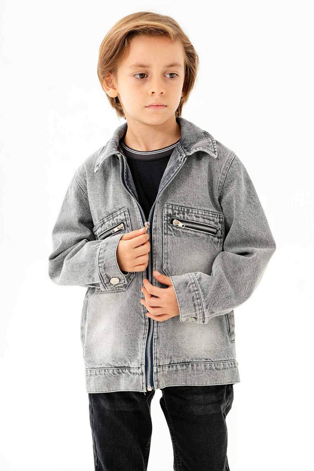 Çift Cepli Fermuarlı Göğüs Cepli Erkek Çocuk Kot Ceket