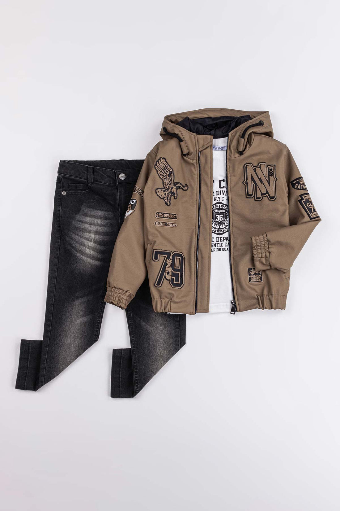 Çift Cepli Kartal Nakışlı Fermuarlı 3'lü Erkek Çocuk Deri Ceketli Takım