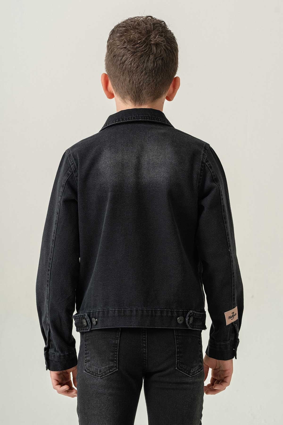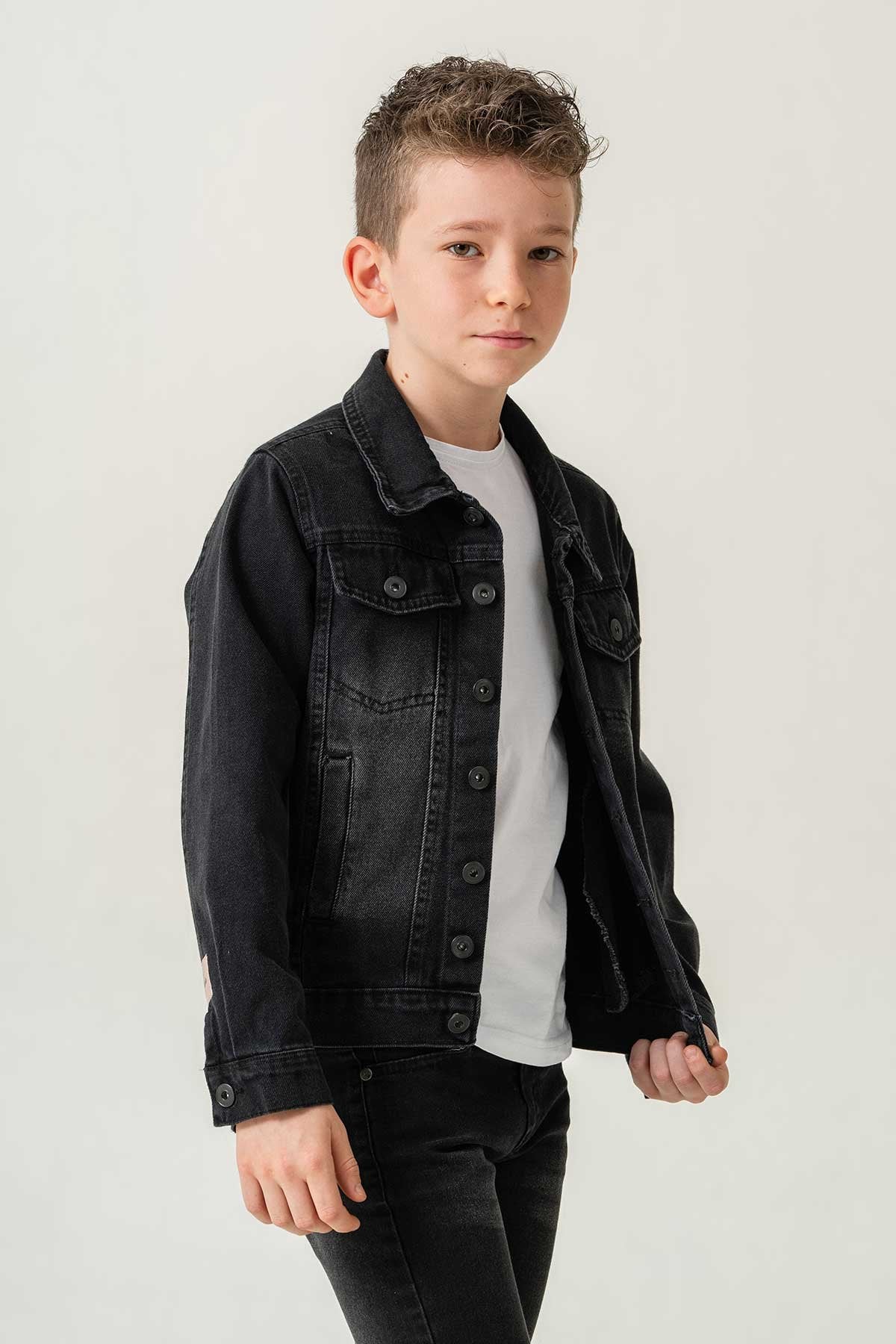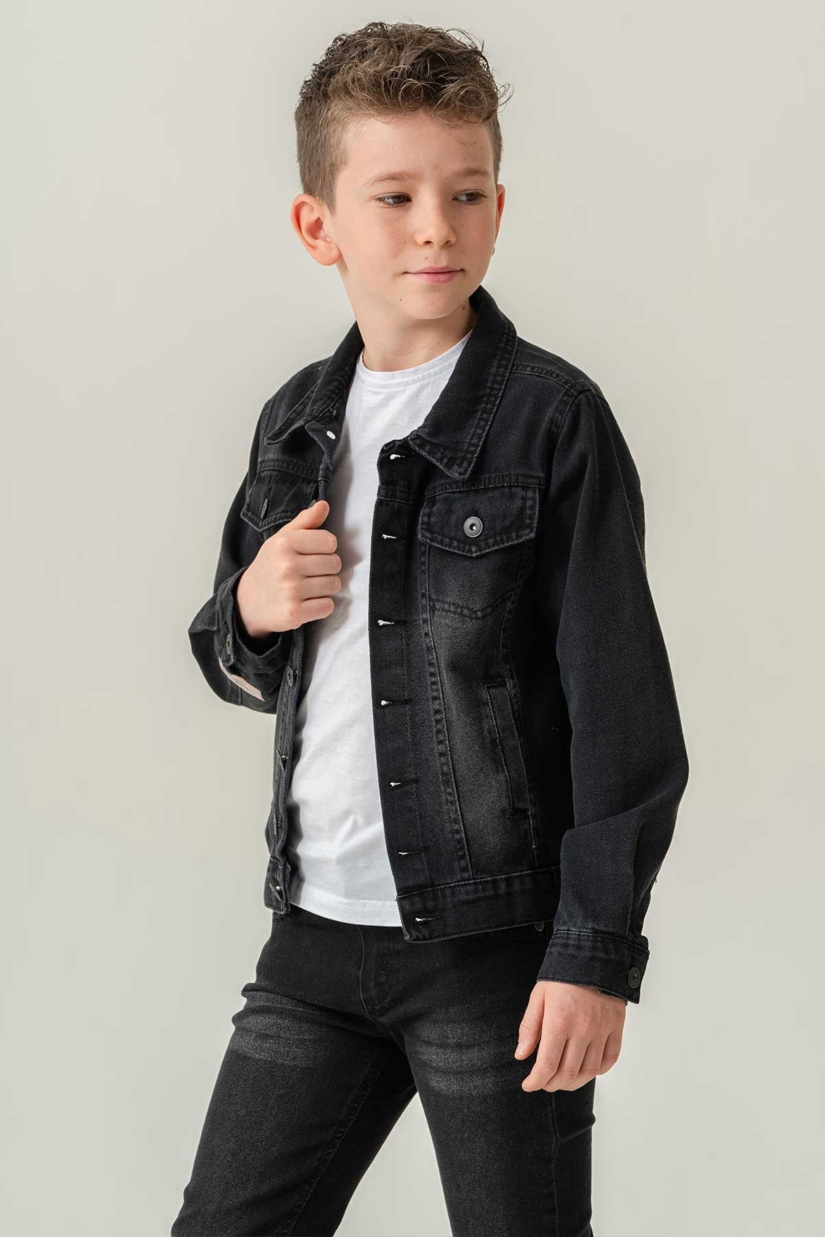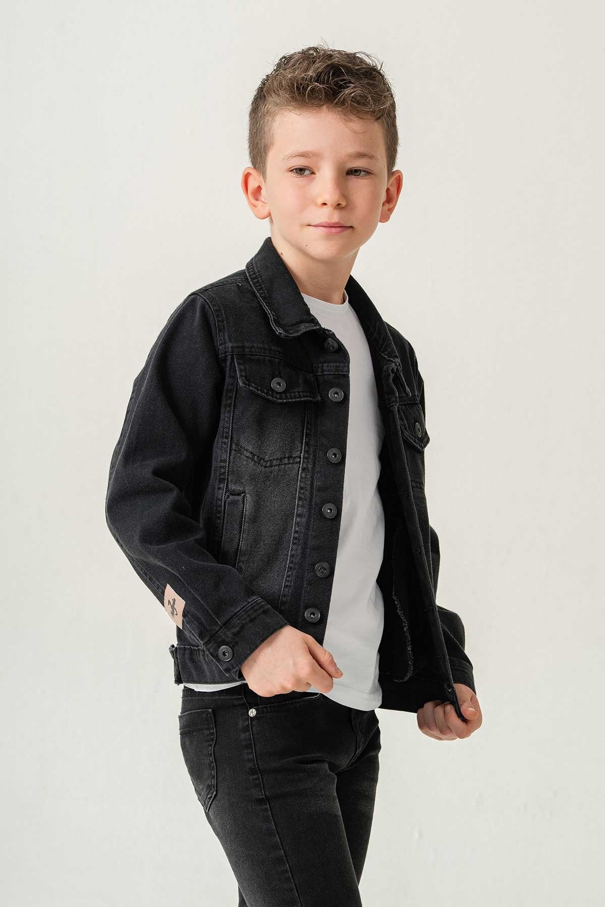 Çift Cepli Düğmeli Siyah Kot Erkek Çocuk Ceket