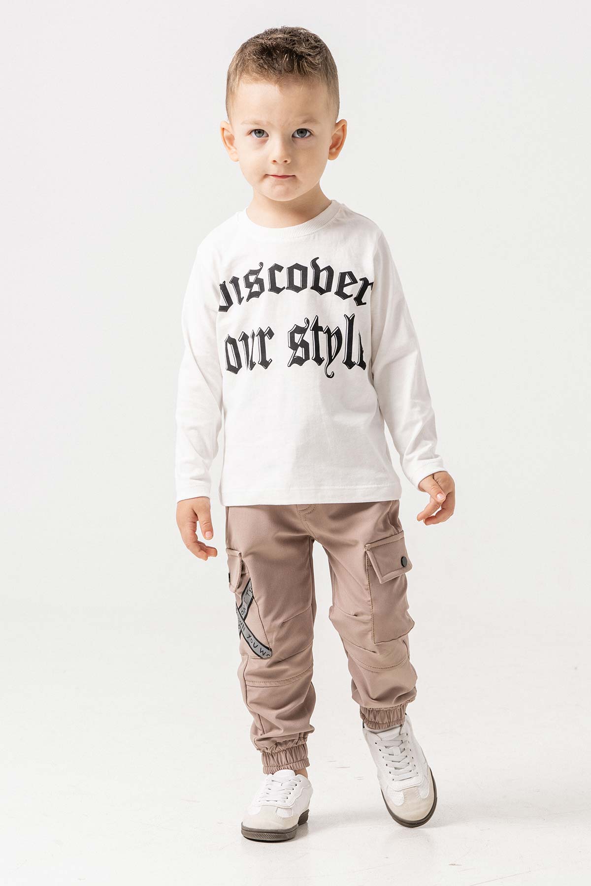 Takımın beyaz, baskılı, %100 pamuklu uzun kollu body’si çocukların hassas ciltlerine uyum sağlarken, pamuklu ve likralı dokuma kumaştan üretilen pantolonu, beli ve paçaları lastikli yapısıyla rahat bir kullanım sunar. Çift cepli ve kordonlu pantolon modeli, hareketli çocukların ihtiyaçlarını karşılar.