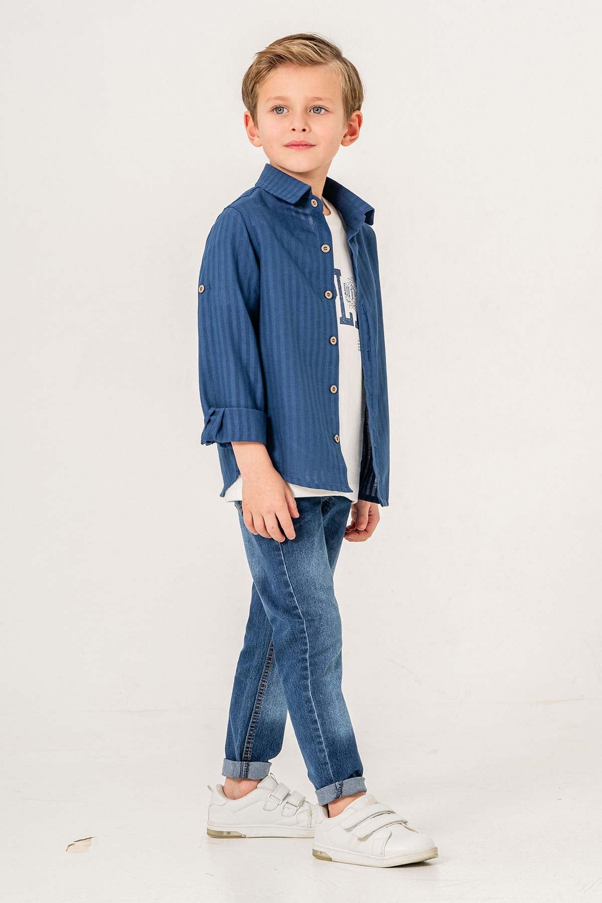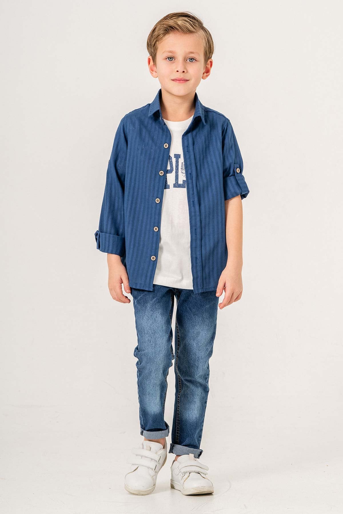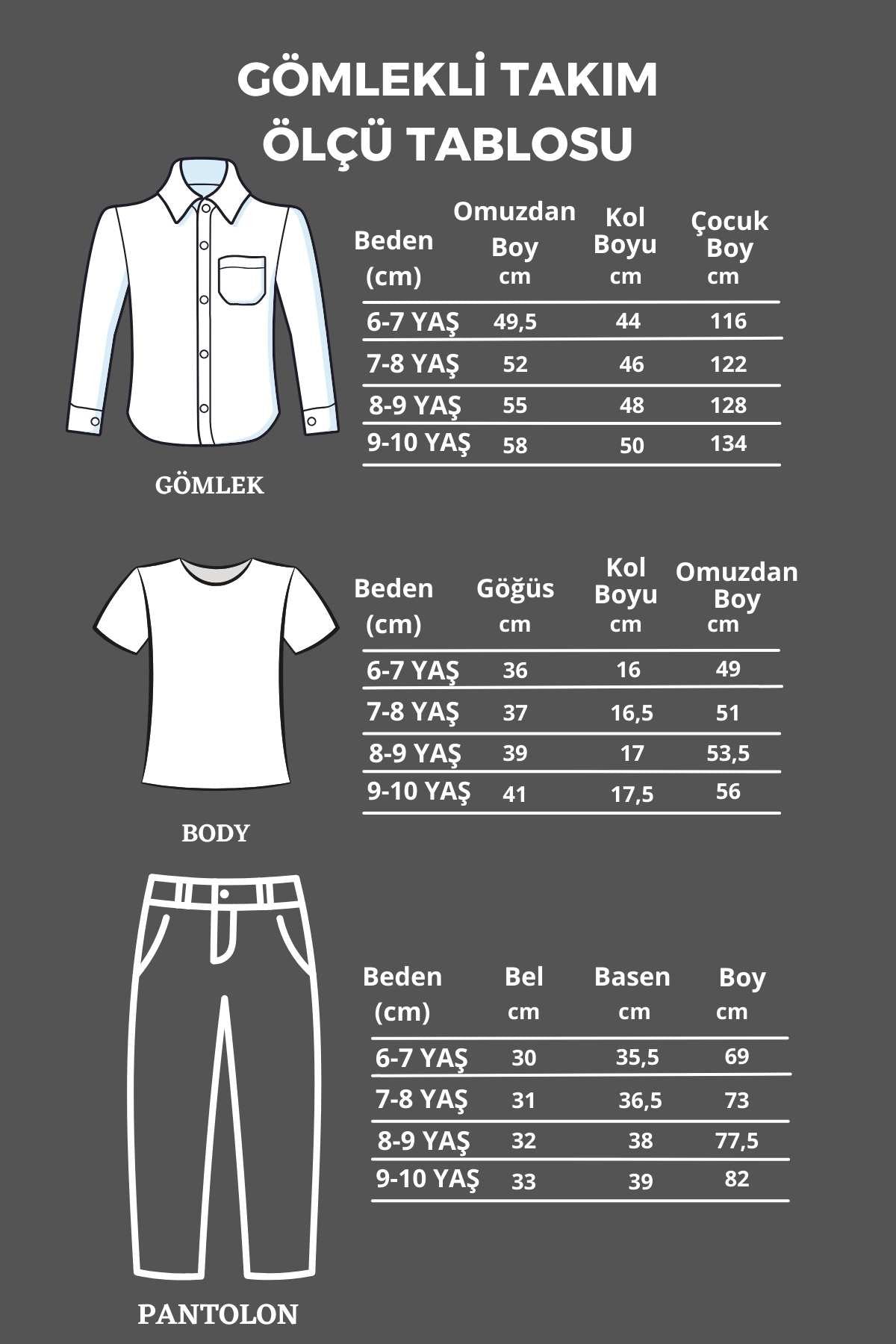 Erkek Çocuk Ayarlanabilir Kol Düğmeli 3 Parça Gömlekli Takım, çocukların rahatça hareket edebilmesi için esnek yapısıyla tasarlanmış olup, aynı zamanda modern bir görünüm sunar. Özel kumaş kalitesi ve ince detayları sayesinde çocuğunuz her ortamda dikkat çekecek!