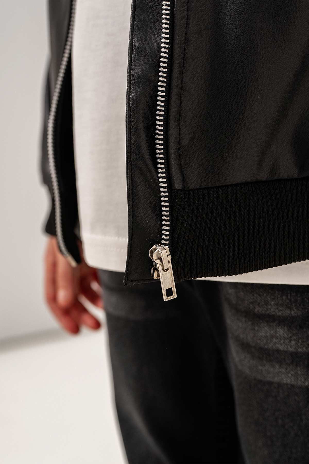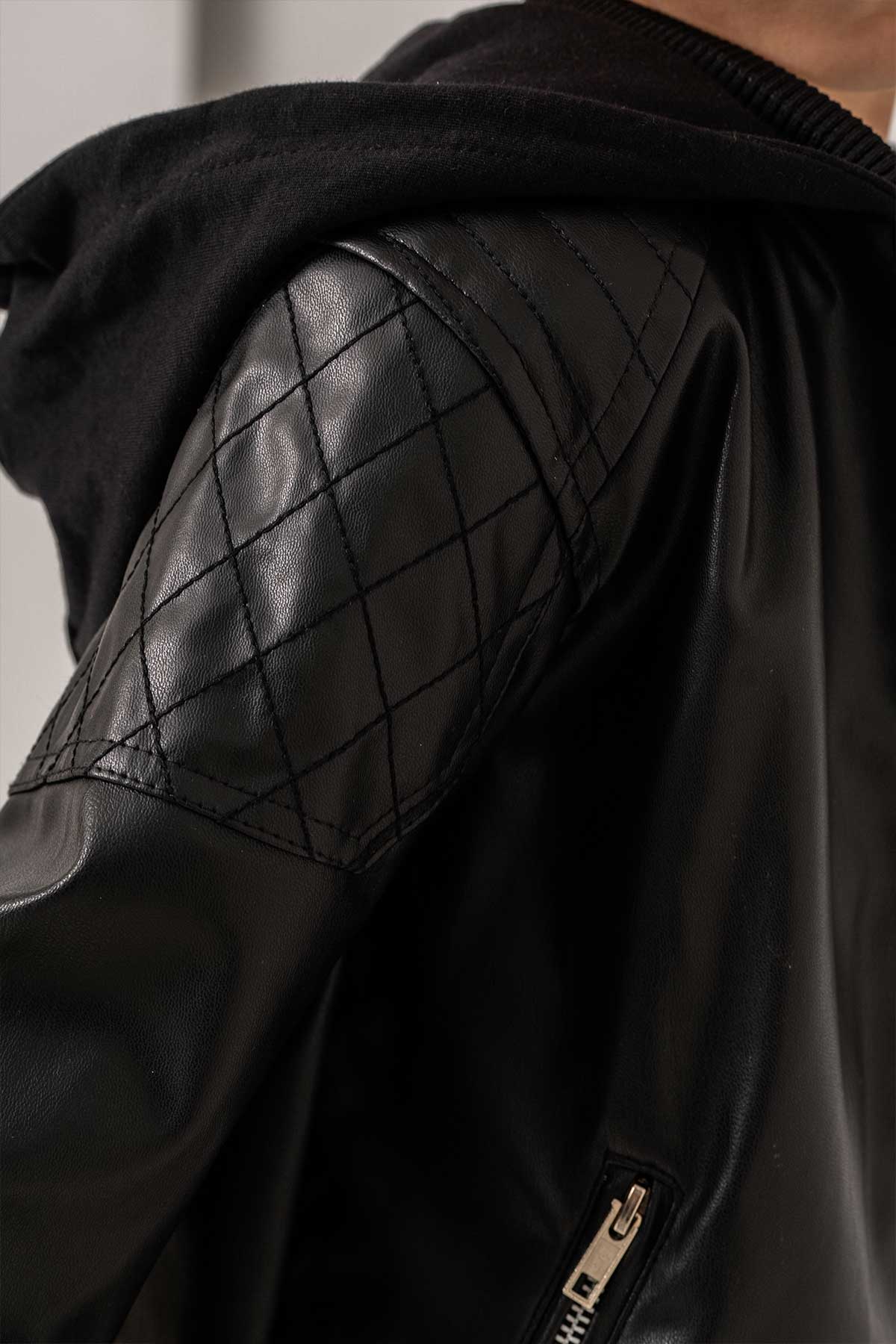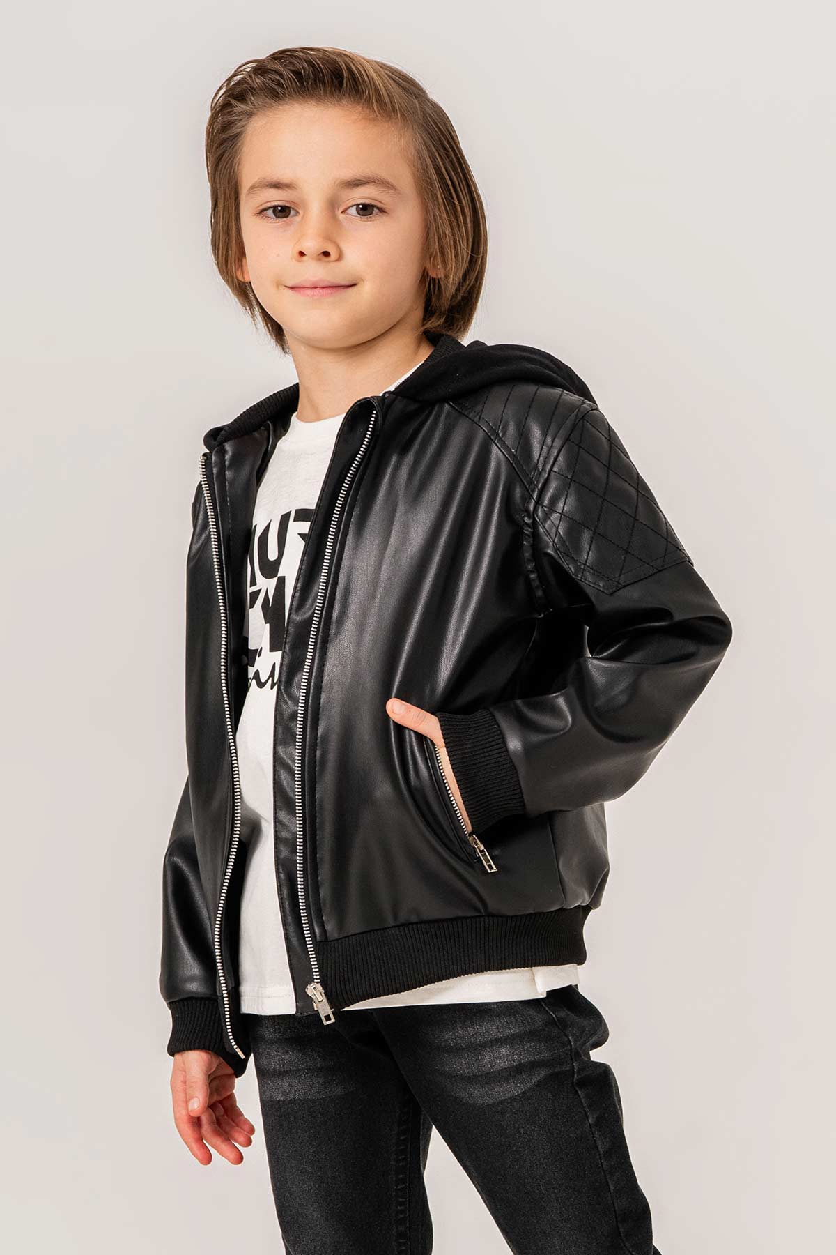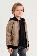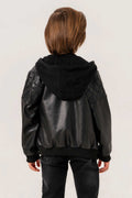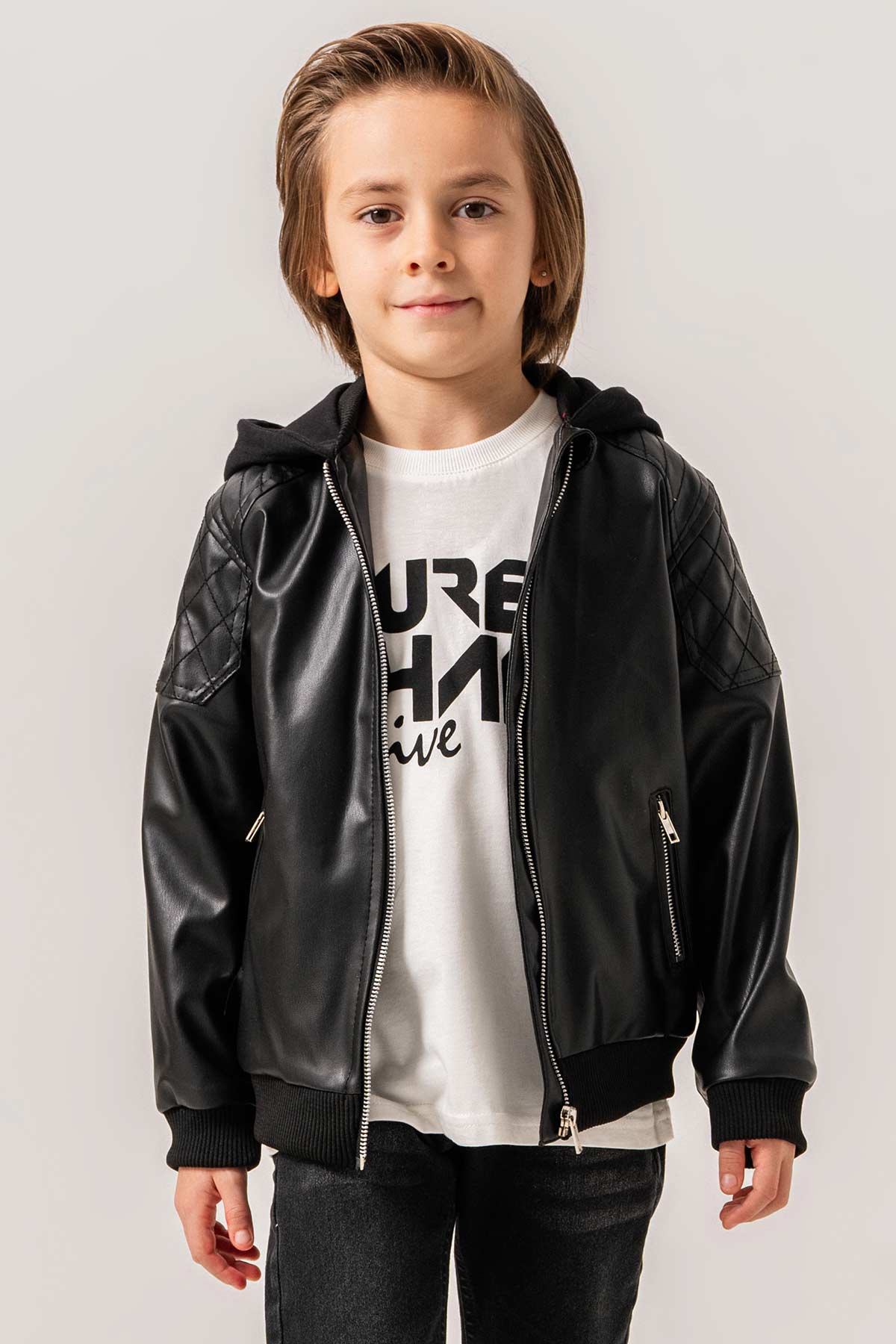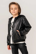 Kapüşonlu Cepli Fermuarlı Erkek Çocuk Deri Ceket