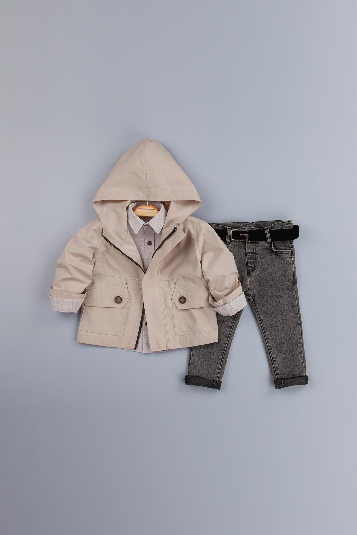 Bu takım, trençkot, gömlek, kot pantolon ve kemer gibi dört temel parçayı içerir. Trençkotun iki adet düğme detaylı cebi, hem estetik hem de işlevsel bir özellik sunar. Ürün, 6-9 aylık ile 9-10 yaş arası çocuklar için özel olarak tasarlanmıştır, böylece farklı yaş gruplarına uyum sağlar.