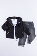 Gold Class Kidswear'ın özel tasarımı olan Kapüşonlu Fermuarlı & Çıtçıtlı Su Geçirmez 3'lü Erkek Çocuk Ceketli Takımı, hem tarzı hem de işlevselliği bir araya getiriyor. Bu takım; ceket, tişört ve pantolon olmak üzere üç parçadan oluşur ve çocuğunuzun stilini tamamlayacak mükemmel bir kombinasyon sunar.