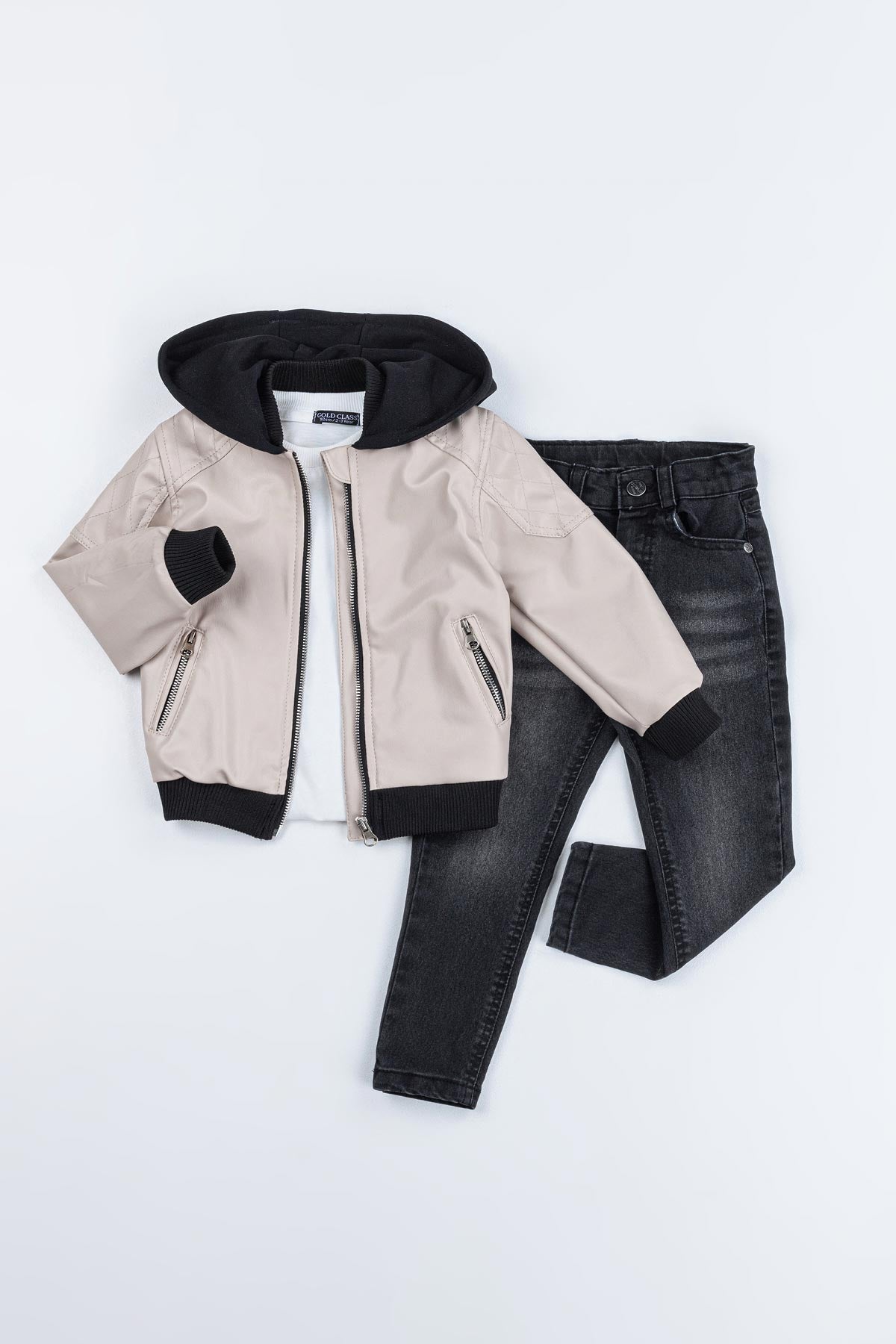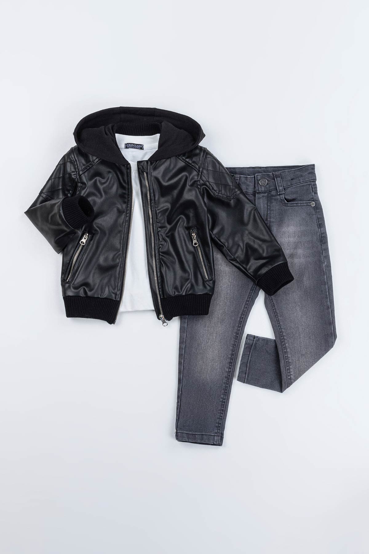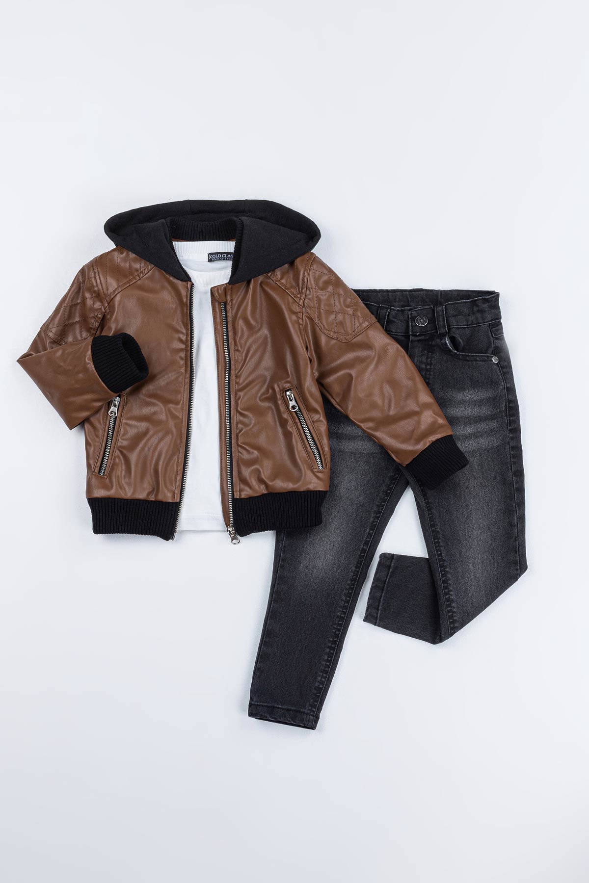 Kapüşonlu Omuz Detaylı Fermuarlı 3'lü Erkek Çocuk Deri Ceketli Takım
