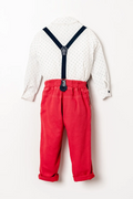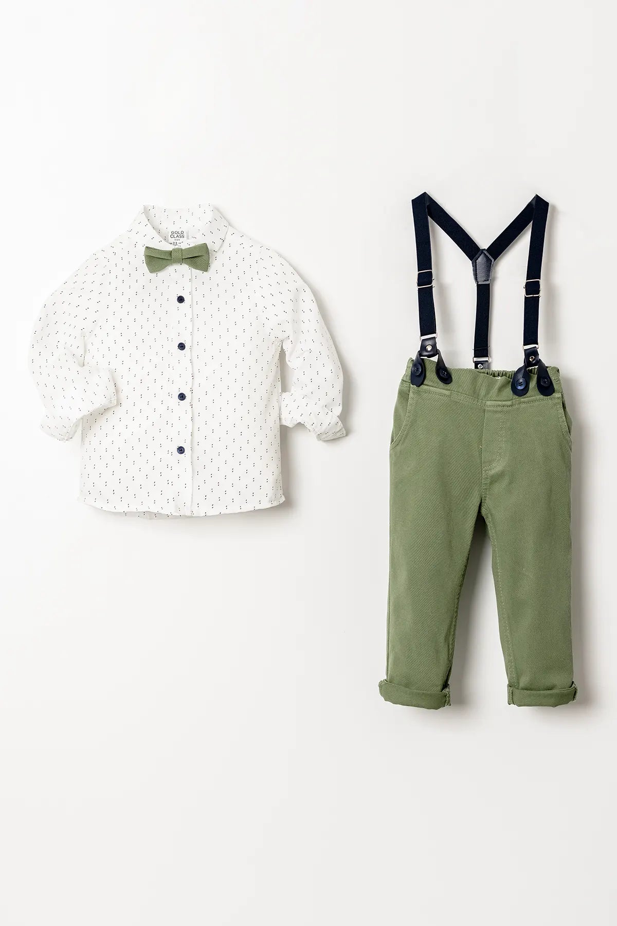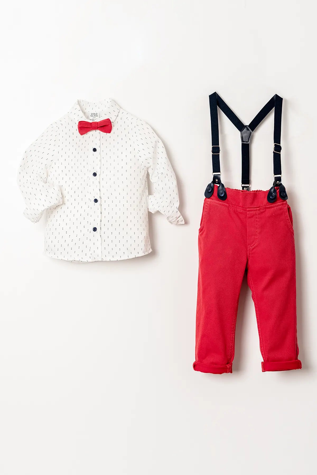 Gömlek, %60 pamuk ve %40 polyester karışımıyla yumuşak bir doku sunarken, üzerindeki çeşitli desenlerle çocuğunuzun stiline renk katar. Uzun kollu ve düğmeli kapama şekli, her mevsim için ideal bir tercih olmasını sağlar. %100 pamuklu pantolon, çift cepli ve beli lastikli yapısıyla çocuğunuzun hareket özgürlüğünü desteklerken, klasik paça tasarımı, takımın şıklığını tamamlar. Salopet askı ve papyon, takımın zarafetini artıran detaylar olarak öne çıkar.